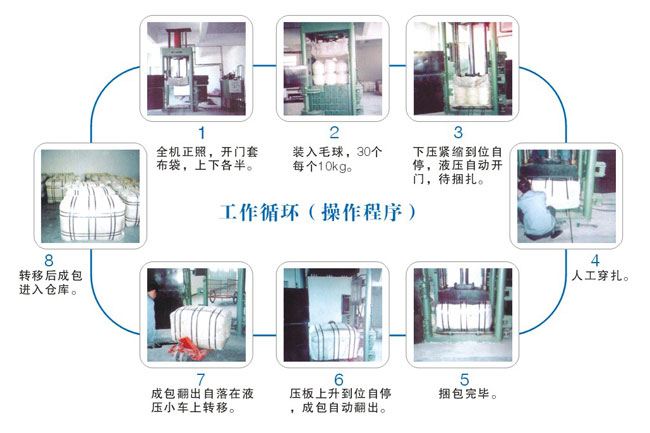 ■ 規格: (按毛球規格定做、代設計)Φ370-380mm,高395mm,重1 0kg;成包數量:30個/包,■ 形式:地面安裝,四立柱機架,四開門形式,上置式油缸,下壓緊縮,控制自停,手動和自動換向控制,人工穿扎,自動翻包,液壓轉移。■ 電器控制、壓力自停、安全裝置、自動回油。■ 電機:11 Kw-4P-1 400轉/分、電器控制全套、儀表全套液壓泵站一個